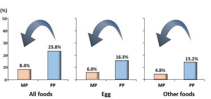 その結果、ミックスパウダーに入れた食べ物全体を見ると、ミックスパウダーグループの参加者83人中7人(8.4%)、プラセボ粉末グループの参加者80人中19人(23.8%)が1つ以上の症状が現れたことがわかりました。卵だけにしぼると、ミックスパウダーグループは6.0%、プラセボ粉末グループは16.3%でした。少しずつ食べていたお子さんのほうが、症状が出にくいことがはっきりわかりました。この傾向は卵でもっとも強く、また、もともとアレルギー抗体を持っていたお子さんのほうが差が大きかったのです。