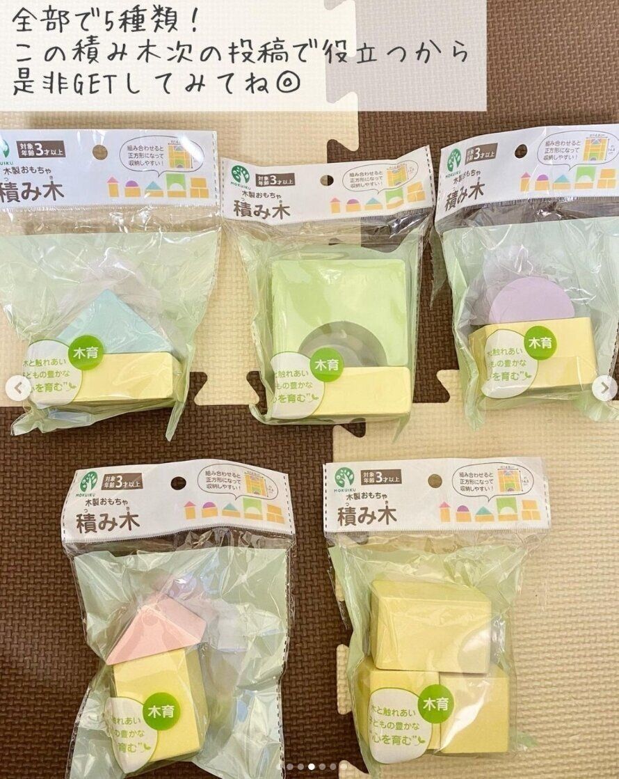 happa_sukusukuさんはセリアの「木製おもちゃ 積み木」を買ったそう。パステルカラーの積み木で、やわらかい色味が可愛らしいですよね。3歳から6歳頃にかけて大人と同じ色彩感覚が育つ時期には、心が穏やかになるパステル調のおもちゃを取り入れるのも良いですね。