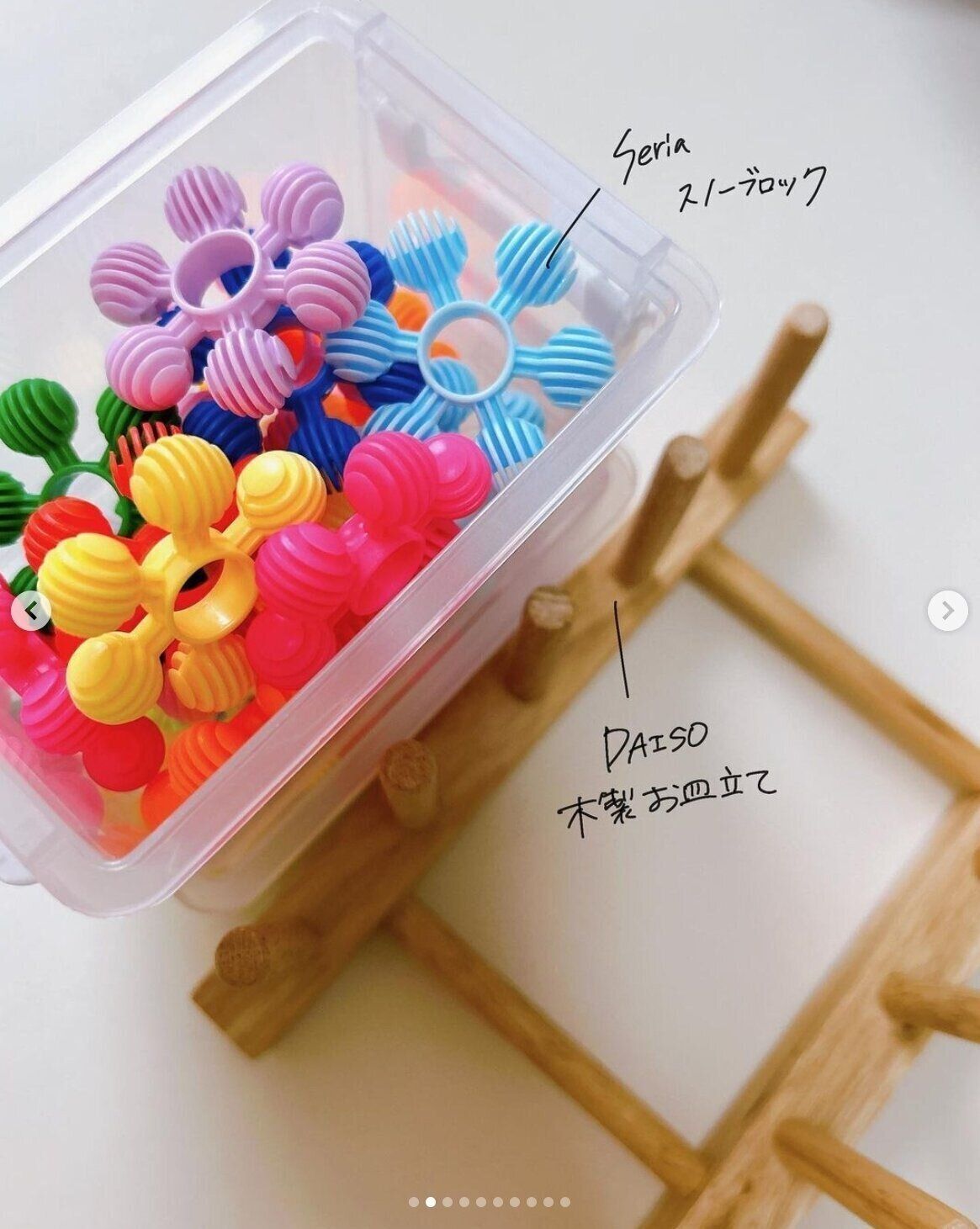 keke_piyoさんはセリアで「スノーブロック」をGET!くっつけたり並べたり、ヒモに通して遊んだりできる優れものとのこと!特にヒモ通しは幼稚園や保育園でも定番の遊びで、両手で異なる動きをすることで繊細な動きを身に付けます。カラフルなパーツなので目にも鮮やかですよね。