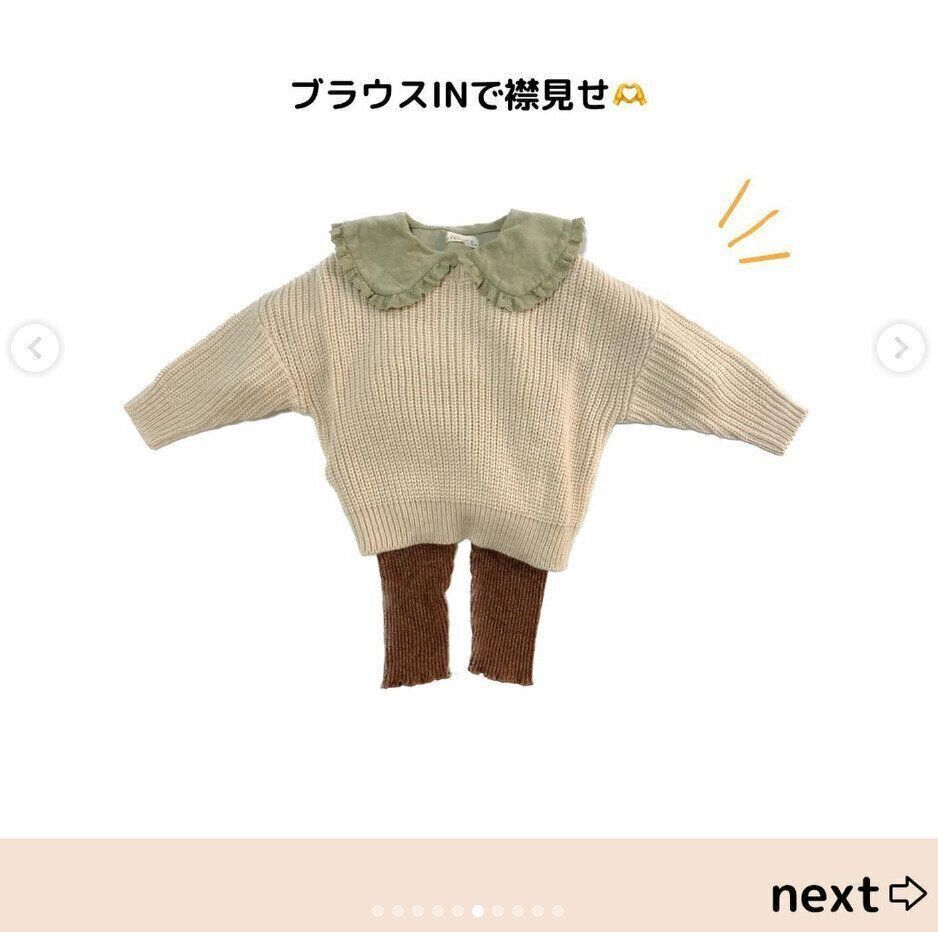 こちらは西松屋で販売されている、ドロップショルダーニット。肩まわりに余裕があるデザインなので、キッズでも着脱しやすく、抜け感のある着こなしが叶うアイテムです。m__i.__miさんのように、ブラウスやハイネックをインナーにして、首もとから覗かせると、さらに素敵◎