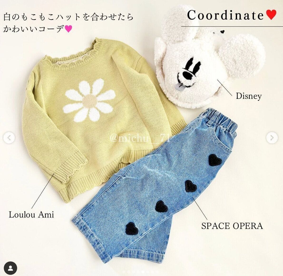 あざやかなグリーンが素敵なこちらのニットは、しまむらで販売されているもの。触り心地がよく、子どものニット選びで悩みがちな「チクチク」がないそうなので、安心して着せてあげられますね♪ michu__71さんは、デニムパンツと合わせて、韓国っぽコーデに仕上げたとのこと!