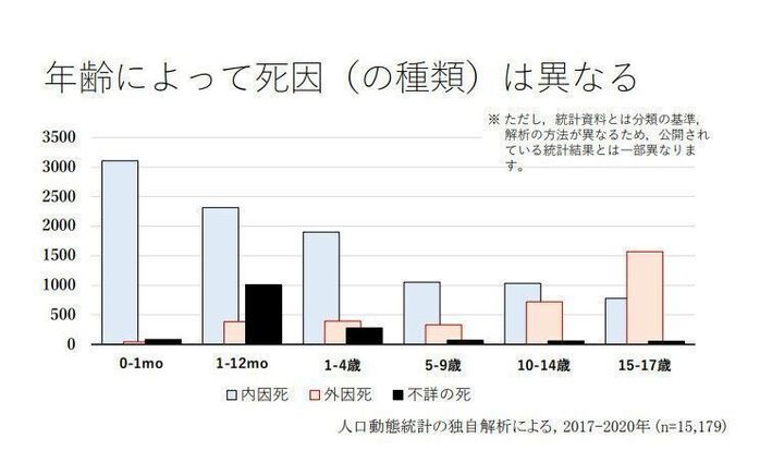 外傷による死亡原因で多いのは、0歳は窒息が大半。1歳以降は、窒息、交通事故、溺水、高いところからの墜落です。