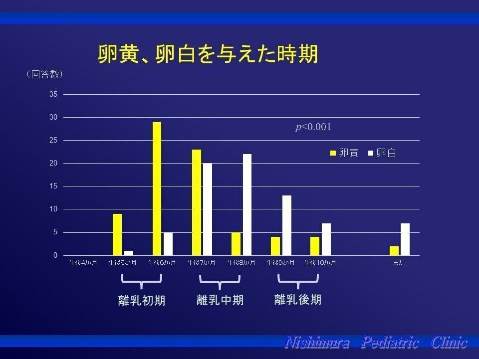 西村 9月の学術集会で私の発表を聞いてくれた小児科クリニックの先生たちに、その場でアンケートを取りました。「湿疹のない乳児だと全卵(卵白を含む)は何カ月からすすめていますか?」という質問に対し、6カ月と答えた人が一番多くて33人、次が7カ月で27人、5カ月(またはそれ以前)と答えた人は20人でした。