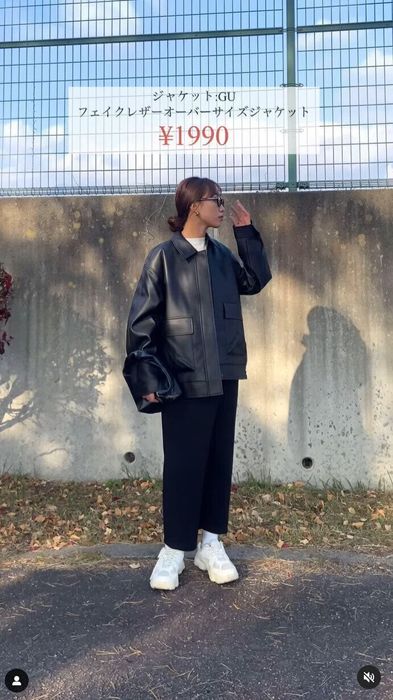 aiさんは、フェイクレザーオーバーサイズジャケットのLサイズを購入。発売当初から狙っていたようで、1,990円でゲットできてうれしい!とのこと。ハリ感のある高見えな素材で、金具もアンティークゴールドと高見え♪ ポケットもついており、機能的にもかなりいい!とお気に入りの様子。カッコいい着こなしですよね!