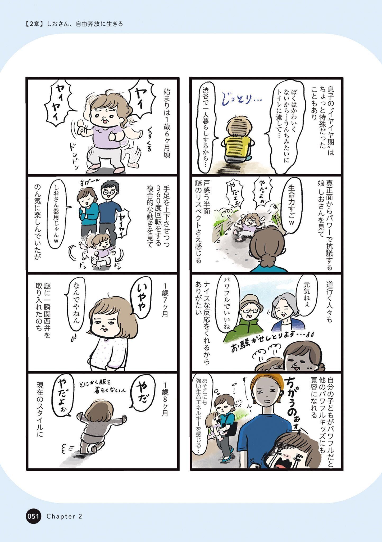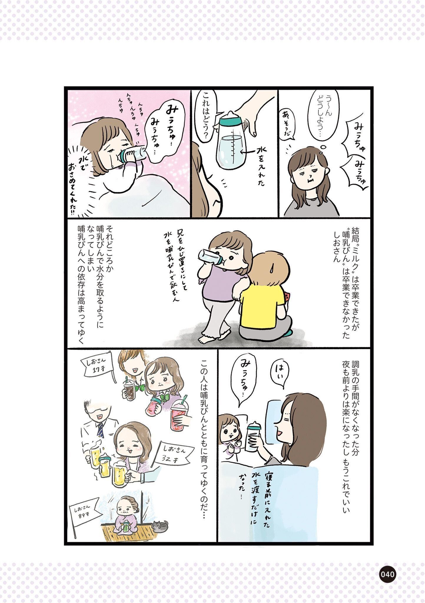また、いい意味で私にも2人目育児の“ゆるさ”が出てきたのかな、と思っています。著書にも描いたのが、しおさんがミルクは卒業できたけれど哺乳びんは手放せなくて、それに対して、私はそこまで悩むことなく、「まぁいいか」と受け止めているエピソード。これはすごくわが家らしい話だなと思っています。今も寝る前に哺乳びんで湯冷ましを飲むのは、しおさんのお守りのようになっています。