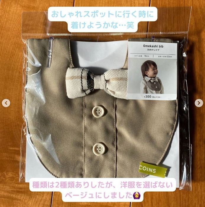 こちらはシナモンママさんが3COINSで購入した「おめかしビブ」。1歳のお誕生日は終わっているそうですが、可愛すぎて思わず買ってしまったんだとか。2種類のデザインがあり、洋服を選ばずに使えるこちらをチョイスしたとのこと◎