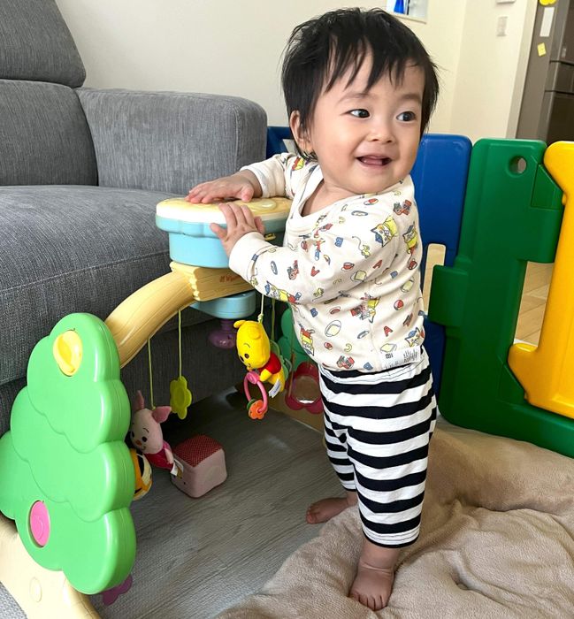 つかまり立ちにすっかり慣れ、片手をはなしたまま振り返ったり、ベビージムについたおもちゃのボタンを押して遊んだりしています。