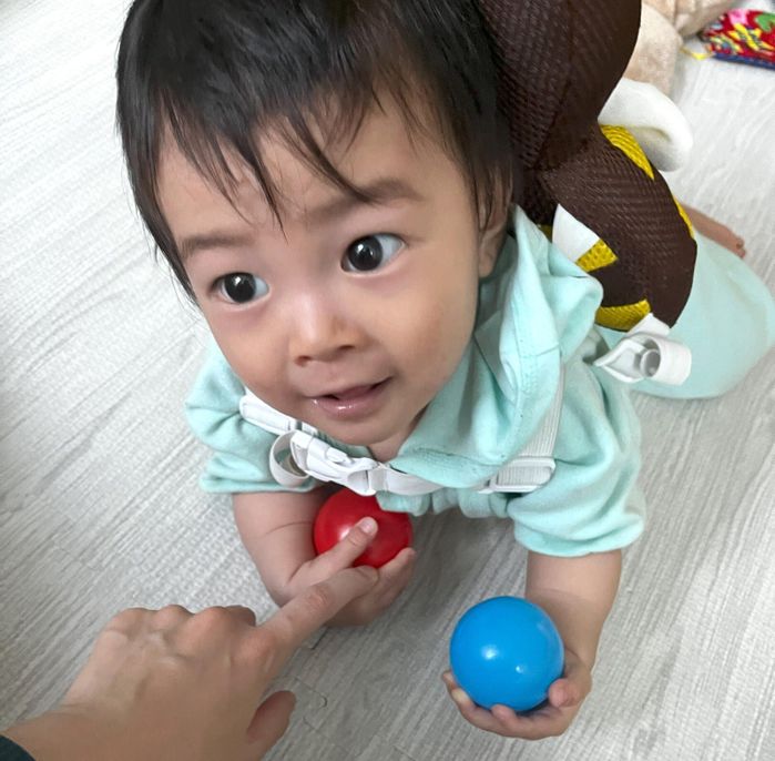 カラフルなボールがお気に入り。まだ意味のある単語は一つも出ていないけれど、持っているボールを指さして「あーか」「あーお」などと色を教え始めました。