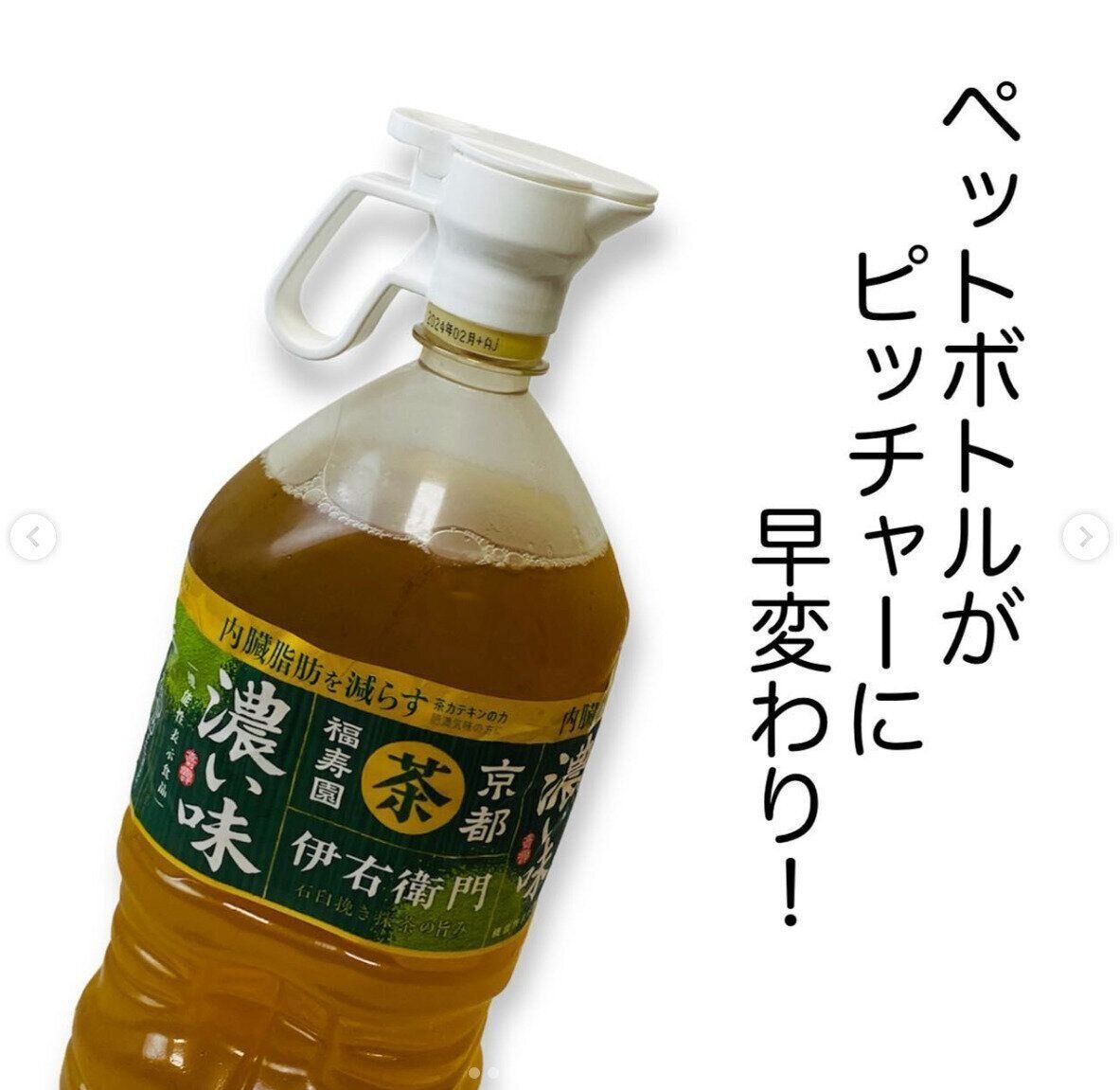 こちらは、ダイソーのペットボトルキャップ。このアイテムをペットボトルに取り付けると、コップにそそぐときに、飲みものがはねるのを防いでくれるんだとか!さらに持ち手も付いているので、冷蔵庫のドアポケットから取り出しやすいんだそうです◎