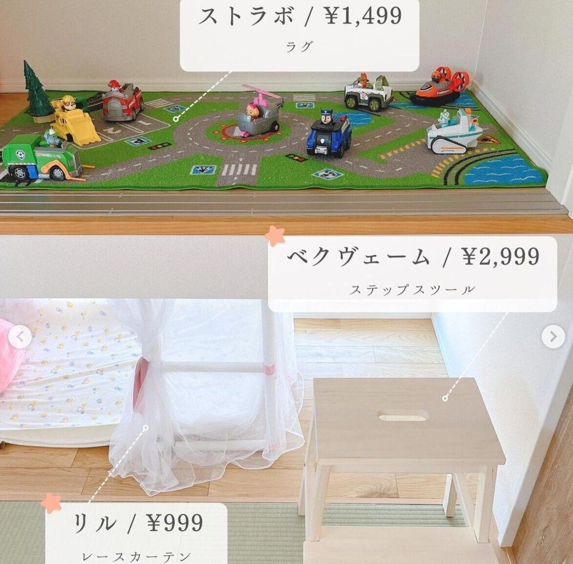 こちらはmido._.homeさんのIKEA愛用アイテムです。「ストラボ」は1,499円、「ベグヴェーム」は2,999円、「リル」は999円だったようで、子ども部屋にピッタリのアイテムばかりですよね!「ストラボ」は車好きのお子さんの遊びがもっと楽しくなりそうなラグですね♪