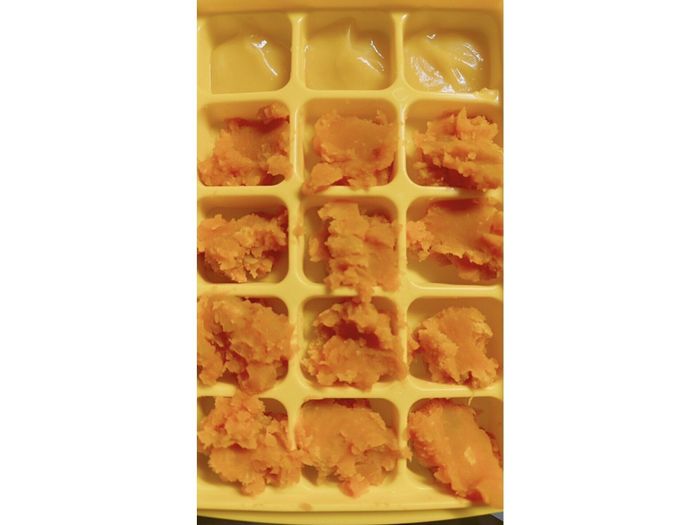 上の写真は、市販の焼きいもをすりつぶしてペースト状にしたものと、電子レンジでやわらかくしてつぶしたかぼちゃを、フリージング用のトレーで凍らせる前のもの。