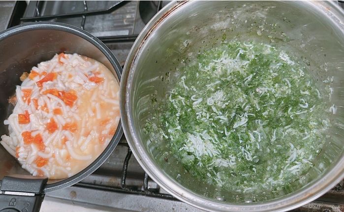食べられる食材が増えてきて、離乳食作りが楽しくなってきました。この日のメニューは、白身魚とトマトとうどんをだしでやわらかく煮て、食べやすくカットしたもの。大根おろしと小松菜のみじん切り、しらす干しを一緒に煮たレシピです。多めに作ってフリージングストックします。