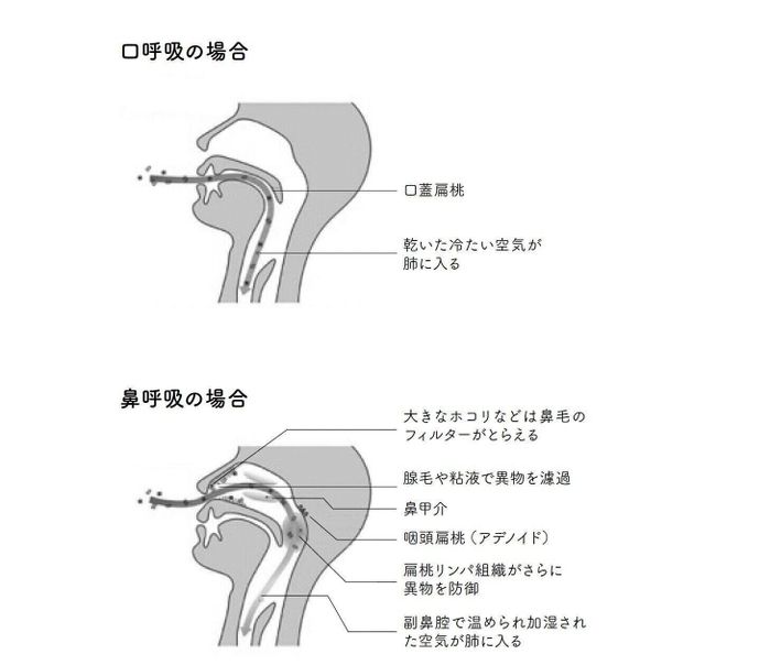 山村 本来、人の体は鼻で呼吸するようにできています。鼻からのどへつながる鼻腔は、内部が短い毛と粘膜で覆われ、鼻から吸い込んだ空気に含まれる小さなゴミや細菌、ウイルス、化学物質が体内に入らないように護る役割をしています。肺にきれいな空気を送り込む、いわば空気清浄機のような役割をしているのですね。