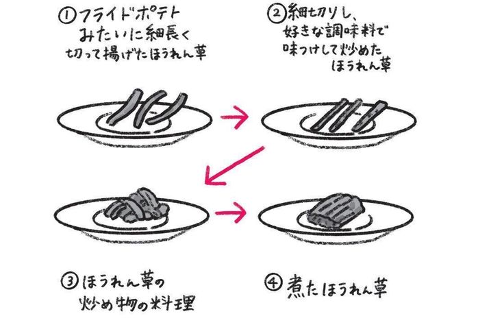 子どもの好きな食感からスタートする、ほうれん草の調理法の一例。