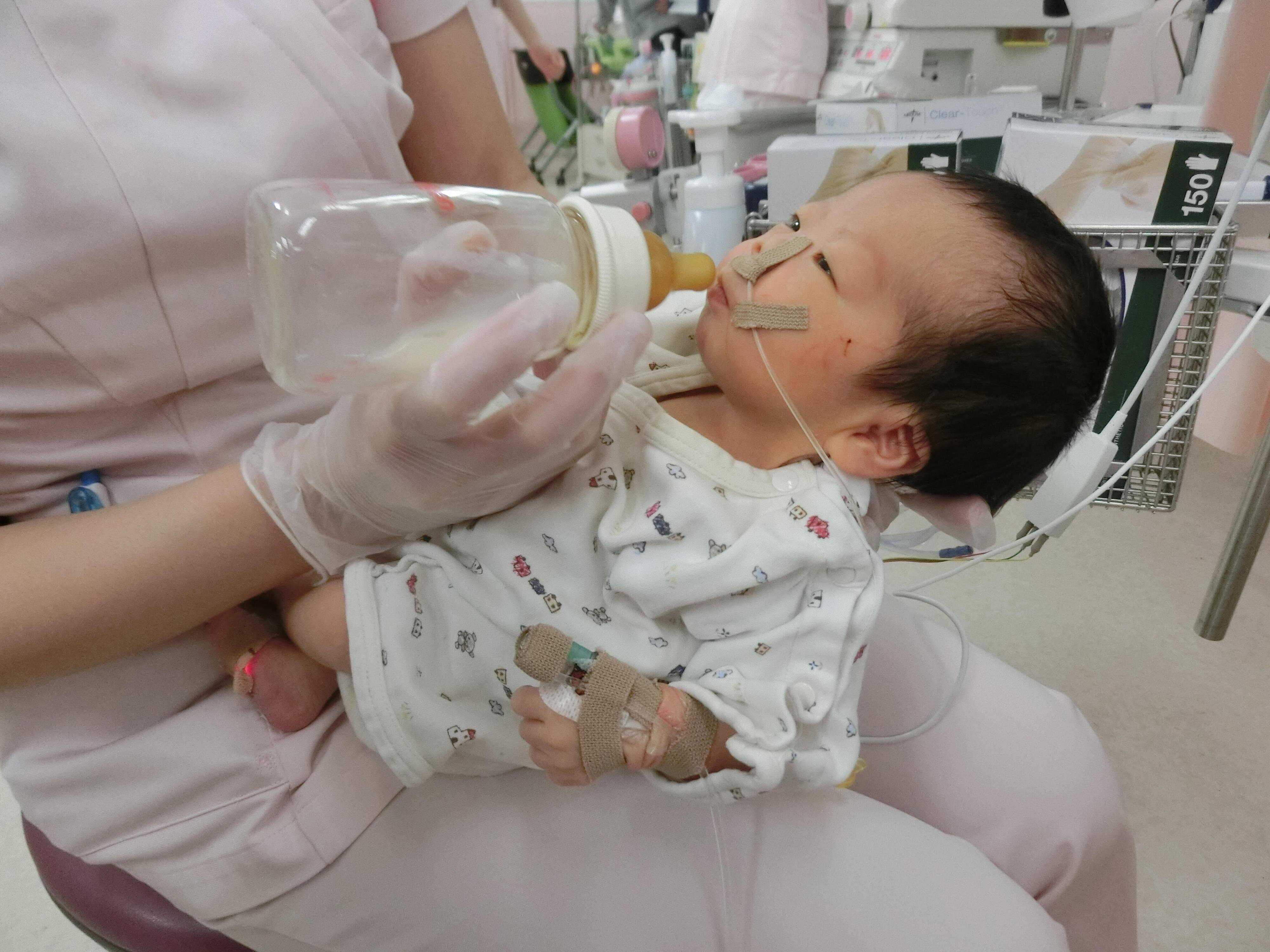 そのため、生後10カ月までミルクは鼻から胃にチューブで注入していました。退院後は哺乳びんで口から飲む練習と栄養をチューブで注入するのと、どちらも行いました。注入は私がしたのですが、毎回1時間~1時間半ほどかかり、誤えんを防ぐためその間ずっと見ていないといけません。苦労して注入してもすぐに吐き戻してしまって・・・。私も睡眠不足で、吐き戻しの洗濯にも追われ、体力的にもしんどかったです。