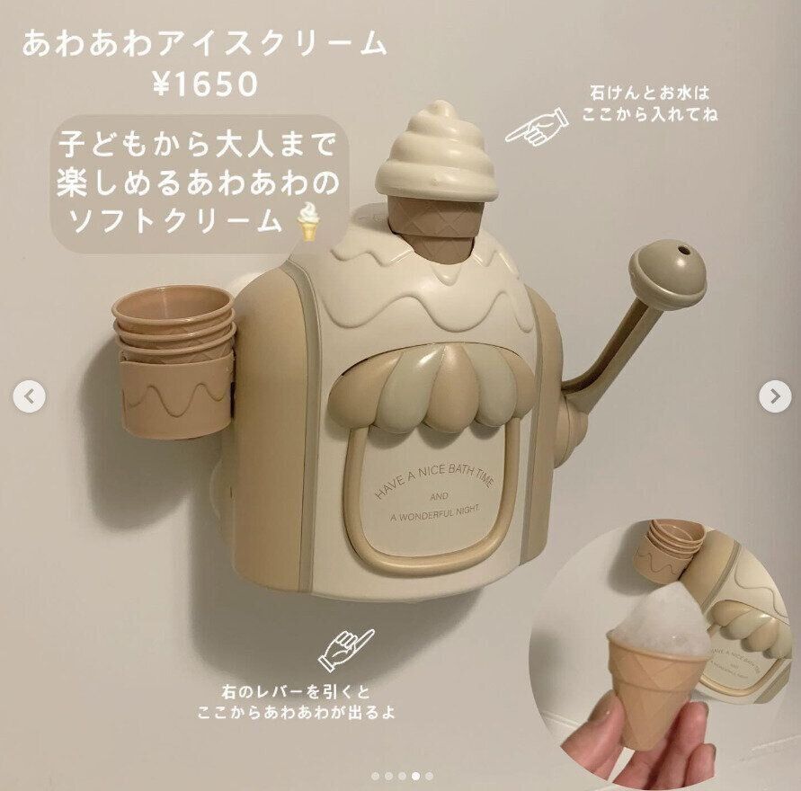 xpiioxさんは、あわあわアイスクリーム(1,650円)を購入。本体にお水とせっけんを入れてレバーを引くと、モコモコした泡が出てくるお風呂用のおもちゃなんだとか。子どもから大人まで楽しめるアイテムですよね。淡い色味の見た目もキュート!これは買いですね。