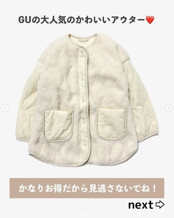 りこさんは、ボアキルティングコートを購入。なんと1,490円ととってもお買い得だったんだとか。中がフリース素材で暖かく、丈長めなのでお尻がかくれるデザインなんだそう。オンラインではほしいサイズがなかったようですが、店舗にはまだあったとのこと。これは要チェックですね♪