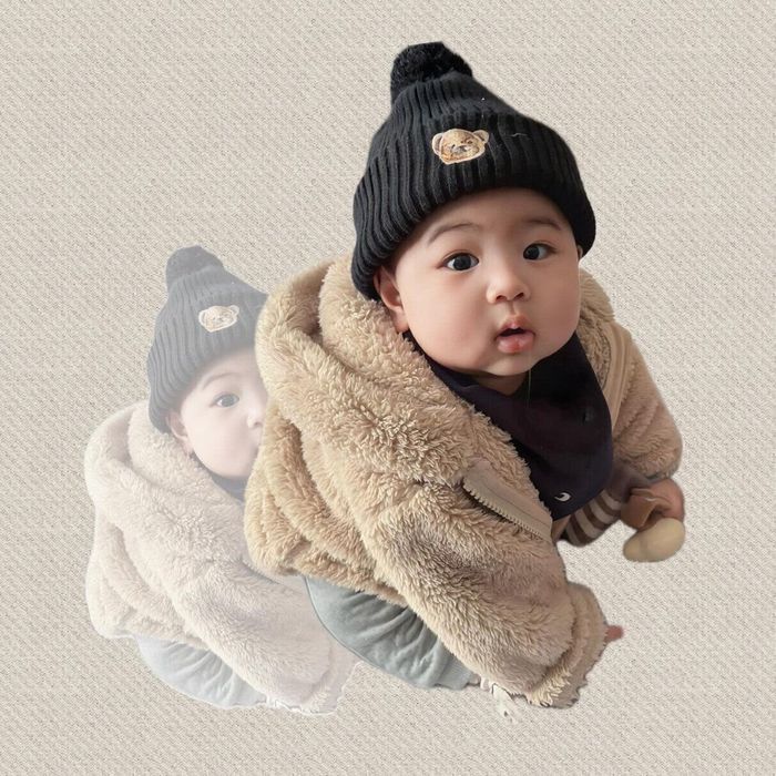 k_fam0508さんは、こちらのフリースパーカーを購入。実はこのパーカー、フードをかぶるとクマさんのようなお耳がついてるんです♪ 左手にくまさんを握って、くま耳パーカーを着て、くまさんのニット帽をかぶった可愛らしいお写真!フードをとった状態でも、首元がふわふわでとっても暖かそうですよね。