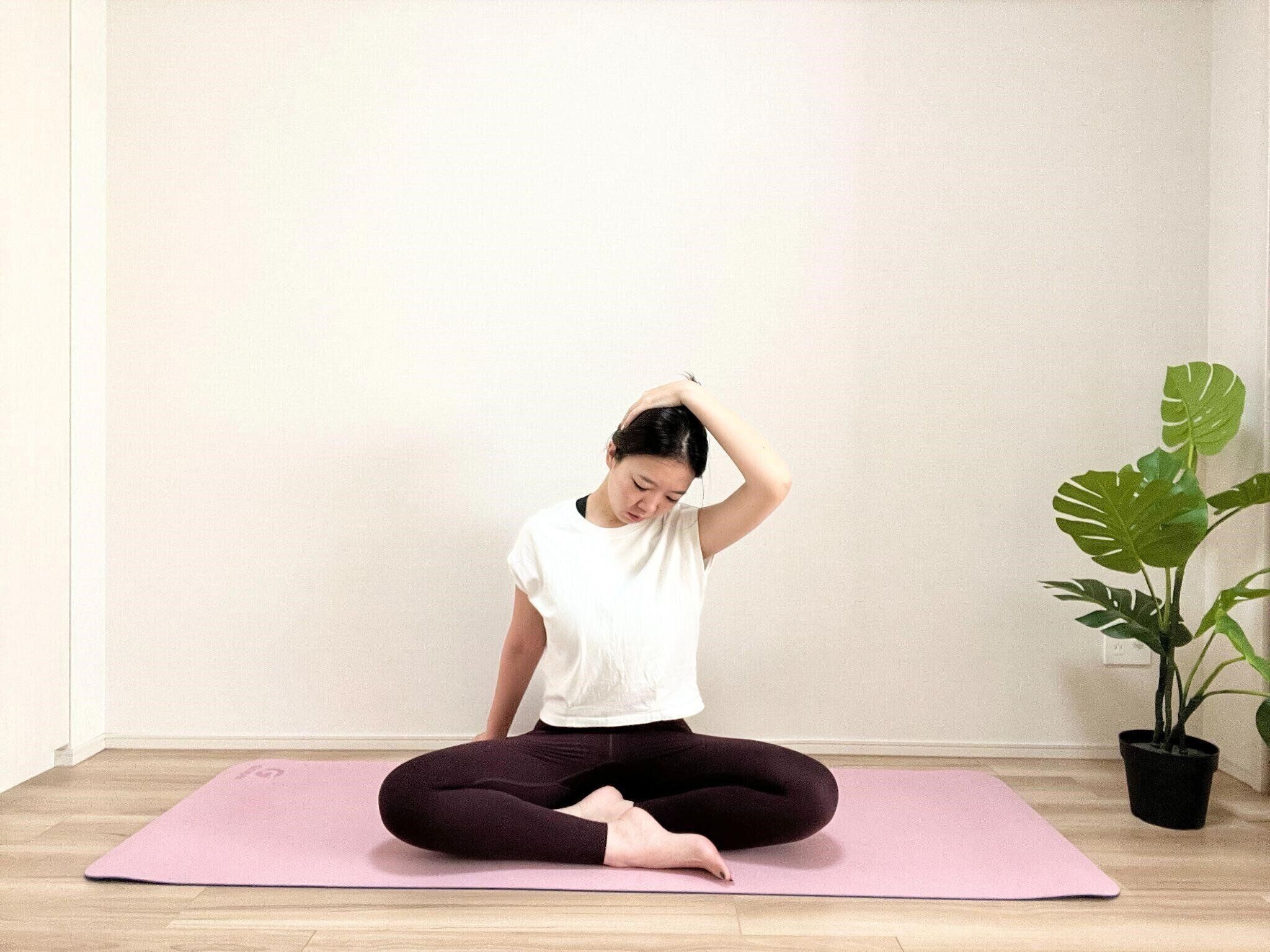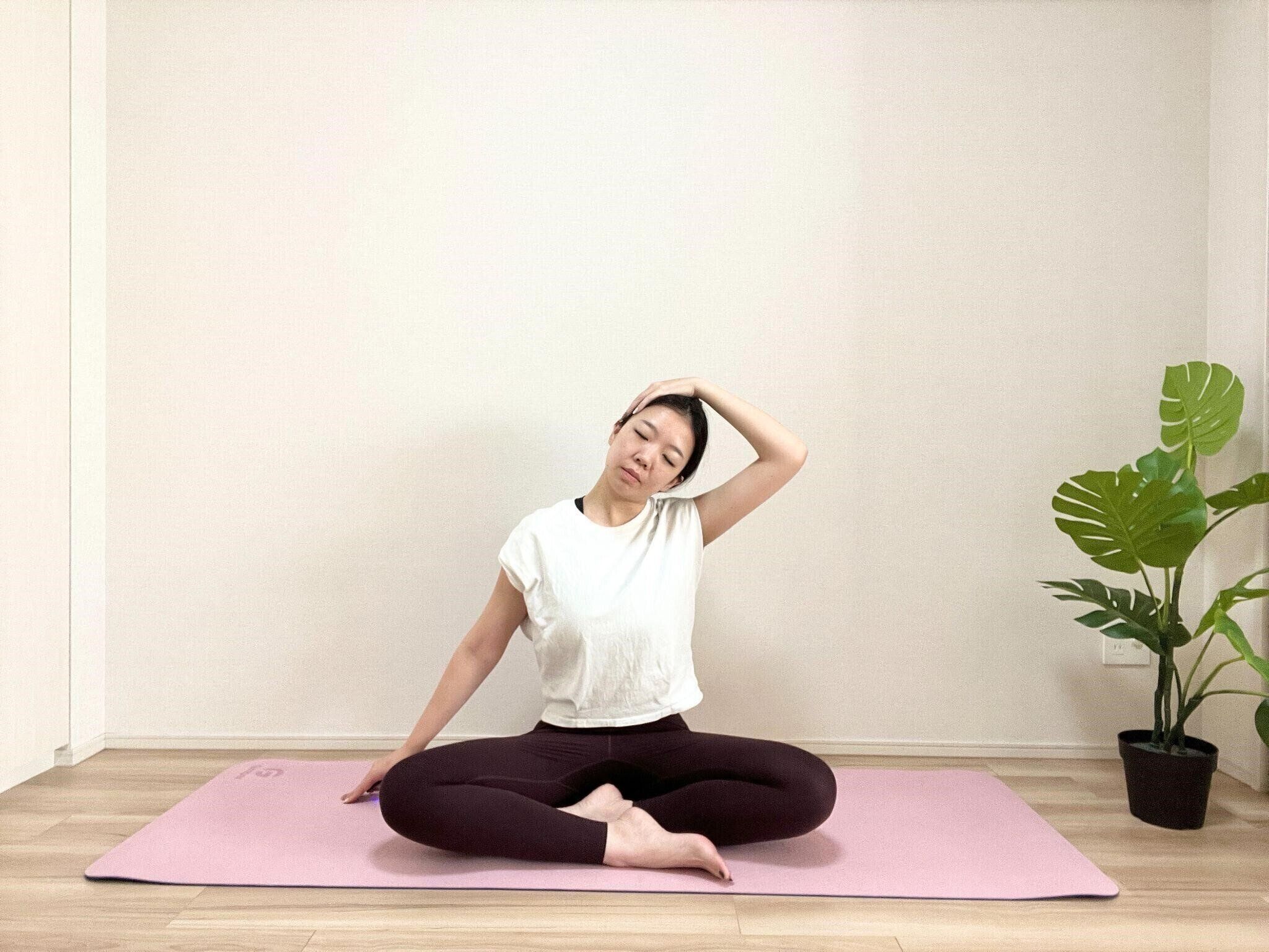 (5)息を吐きながら頭を斜め前に倒して、10秒ほどキープする。