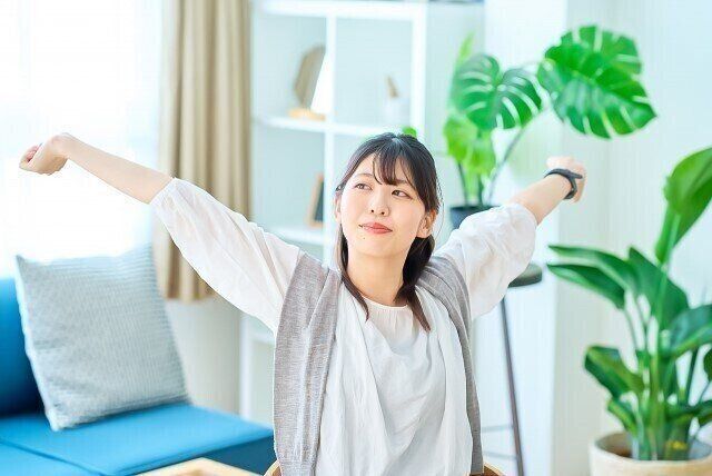 同じ姿勢を続けていると首や肩に大きな負担がかかります。こまめにストレッチができればいいのですが、仕事中や家事・育児中は難しいかもしれません。そんなときは1時間に1回程度、伸びをしたり少し歩いてみたりするだけでもOKです。ずっと同じ姿勢を続けないように心がけましょう。