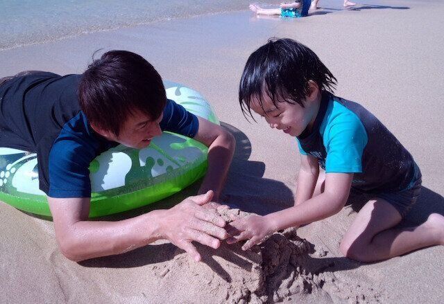 長男が4歳のとき。ハワイの砂浜でパパと一緒に砂遊び。