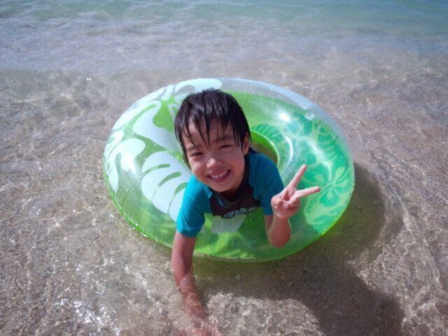 長男が4歳のころ、ハワイで。足が不自由な長男も浮き輪をすれば海で遊べます。