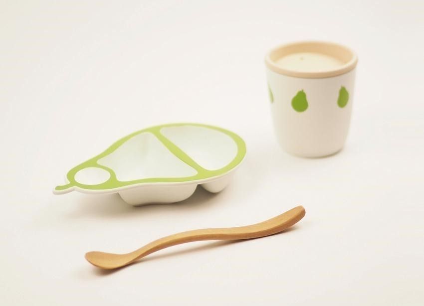 離乳食初期〜後期まで、長い期間使えるのが「PERA」セット。淡い緑の縁取りで洋ナシの形を模したデザインになっており、お皿は2つに仕切られています。これなら、1度の食事で2種類のご飯を準備しても味が混じることがありません。
