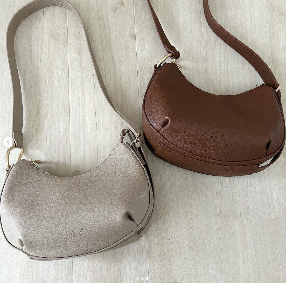 こちらは「tal.by yumi.(タル バイ ユミ)」の、ハーフムーンバッグ。ロゴだけのシンプルなデザインですが、「形がかわいすぎる!」とSNSでも話題に。ayu_kotaraiさんは、財布やスマホ、ハンドタオルや保険証などを入れたそうですが、まだ余裕があったとのこと♪ 高見えするバッグなので、オケージョンコーデにも合いそうですね!