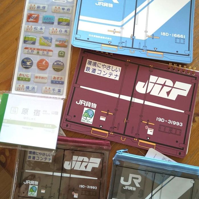 たかこさんは、シール、リングノート、クリアポーチを購入。ぷっくりシールは、国鉄時代のヘッドマークや行先表示のデザインがファンの心をくすぐりますよね。リングノートとポーチは、JR貨物のコンテナデザインが実物そっくりに再現されています。見ているだけでも楽しめるアイテムですね。