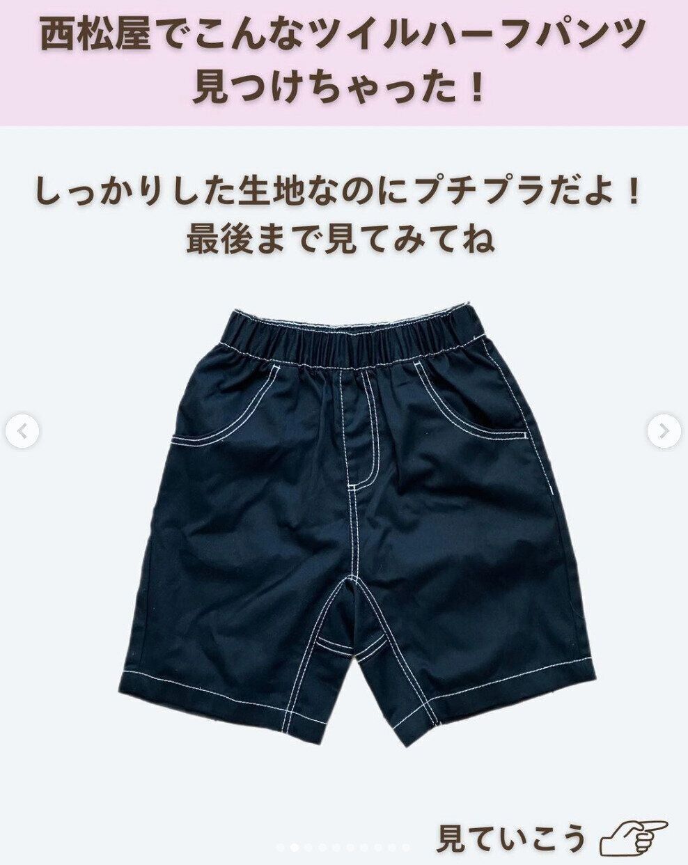 こちらはchikkun.kids_outfitさんが西松屋で発見した、ツイルハーフパンツ。ブラックにホワイトのステッチがかわいくて、気に入っているんだそうです♪ 977円とプチプラ価格なのに、生地もしっかりとしているんだとか!シャツやボーダーTシャツと合わせて、春コーデを楽しむ予定とのこと♪
