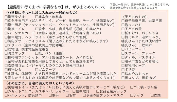 清永 防災のために何を備蓄しておくべきか、どんなものを非常持ち出し袋に入れておくといいのかは、赤ちゃんの月齢や家族の状況によって異なります。家族で相談しながら準備し、定期的に見直すことが大切です。