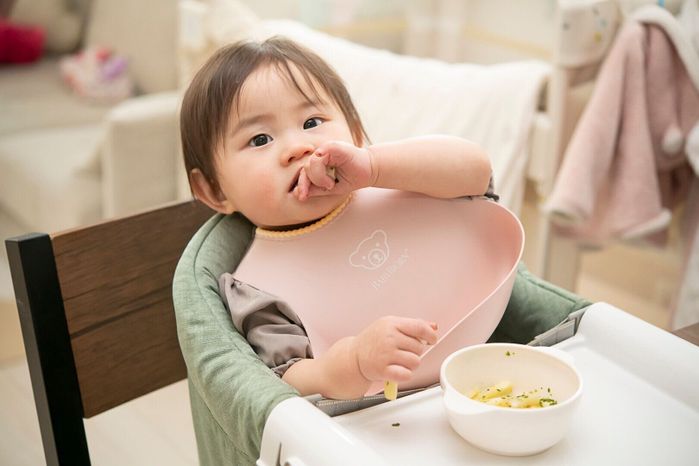 1才を過ぎ、あんよができるようになった莉緒(りお)ちゃん。食事の量も増え、手づかみ食べでスティック状の野菜や、おにぎりも食べるようになりました。