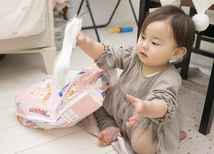 袋からおむつを次々取り出してシールの部分をはがしたり、静かだなあと思ったら、床一面にティッシュペーパーが散乱していたり…。とくに私が使っているものが気になるようで、最近は化粧品を両手に持って、おもちゃで遊ぶようにカチカチぶつけ合っていたのであわてました。危ないものを手にしないよう対策が必要ですね。