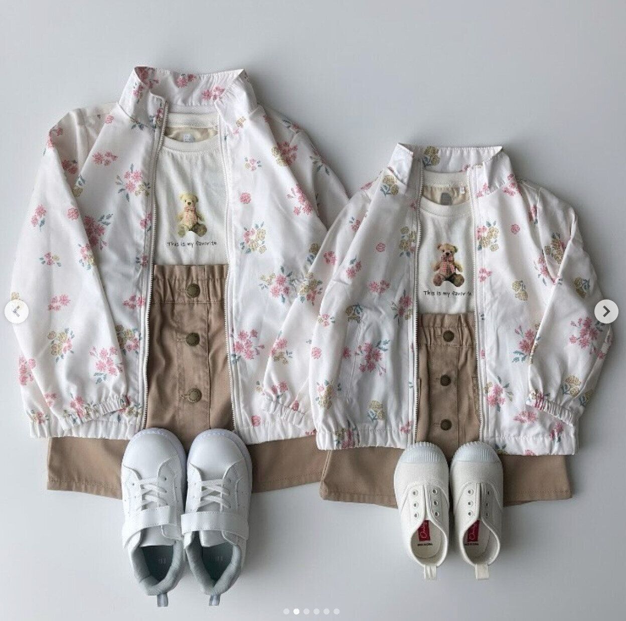 こちらは、nanaさんがオール西松屋アイテムで組んだ姉妹リンクコーデ。ホワイト×ベージュで統一されており、まとまりのあるコーデが完成しています。ピンクの花柄が春っぽいナイロンジャケットは、フードが付いておらず軽いので、これからの時期の外遊びにもぴったり!まだ寒い時期は、インナーを裏毛トレーナーにしたり、レギンスをレイヤードしたりすると、コーデの幅が広がります♪