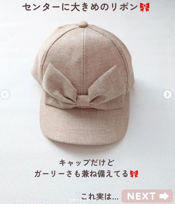 chapi_1205さんが西松屋で発見したのは、こちらのキャップ。中央に付けられたリボンがかわいいですよね!ブラックとベージュが販売されていたようで、どちらか選べず、2色ともゲットしたんだとか♪ 麻っぽいポリエステル素材で、通気性もよく、これからの季節に大活躍しそうなアイテムなんだそうです◎