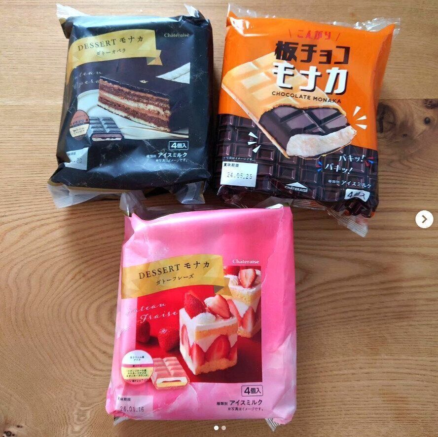 こちらは、DESSERTモナカの「ガトーフレーズ」「ガトーオペラ」と、こんがり板チョコモナカです。ただいまmayumi__houseさんのお宅では、モナカアイスにどハマリ中なんだそう。消費量が激しいので、安いアイスは助かる!とのこと。冷凍庫の1段がアイスで埋め尽くされたようですよ♪ 食べ応えありそうなアイスですね。