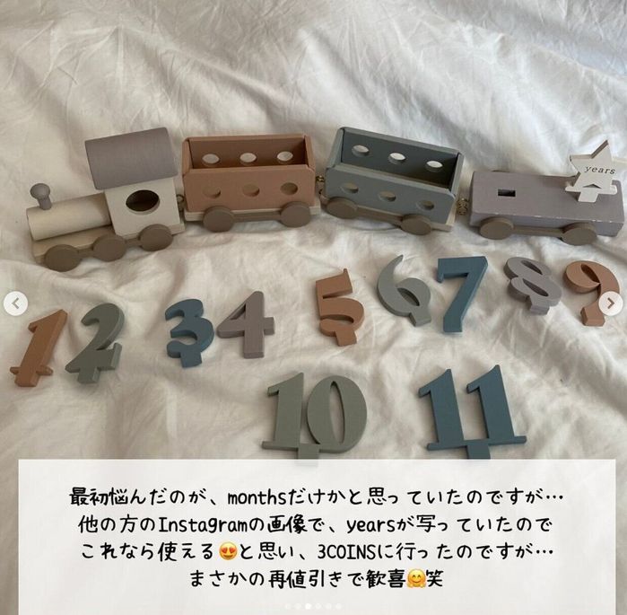 シナモンママさんが購入したのは、こちらのバースデートレイン。以前から購入するか悩んでいたところ、165円に値下げされていたためゲットしたとのこと♪ 月齢や年齢に合わせた数字を列車に乗せて、撮影できるようになっているようです。