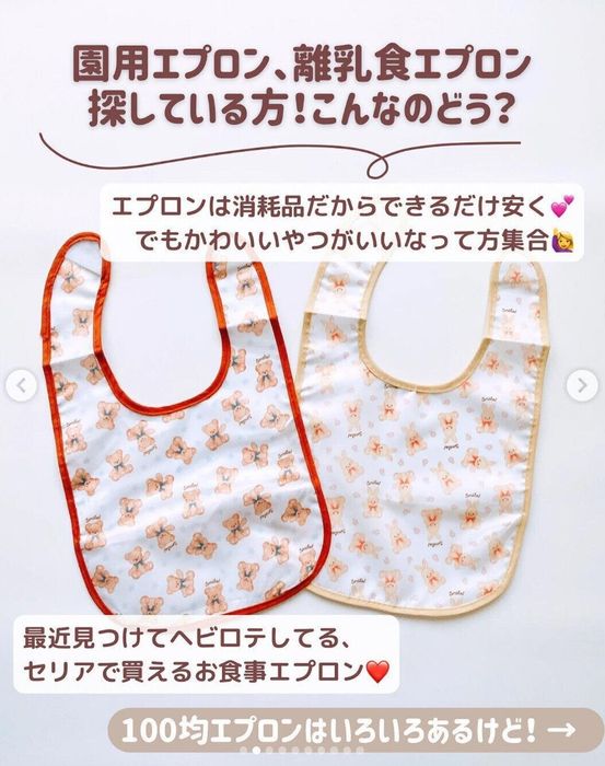 こちらはtntn_wearさんがセリアで購入した「ベビーランチスタイ ハグフレンズ」。洗っても柄がはげたりシワになったりしにくい点が最高なんだとか♪ デザインも気に入っているようでヘビロテしているとのこと。スタイの下部に食べこぼしをキャッチするポケットも付いているようです。