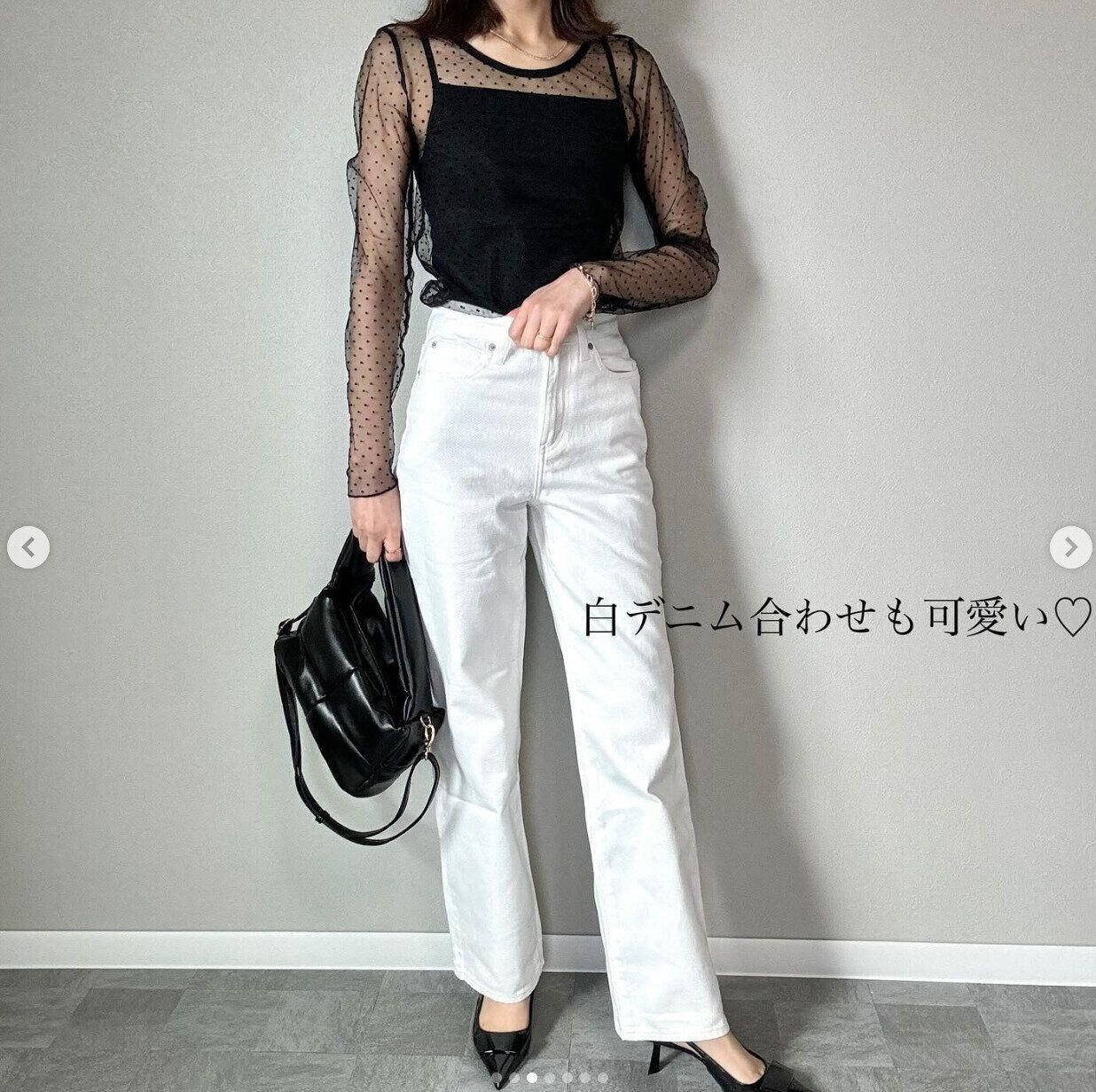 こちらはsis_y1010さんがしまむらで購入した、ドット柄のシアートップス。小ぶりのドット柄がアクセントになっているところが、気に入っているんだとか!ホワイトデニムを合わせたり、ロングジレやデニムジャケットを合わせたりして楽しんでいるとのこと♪