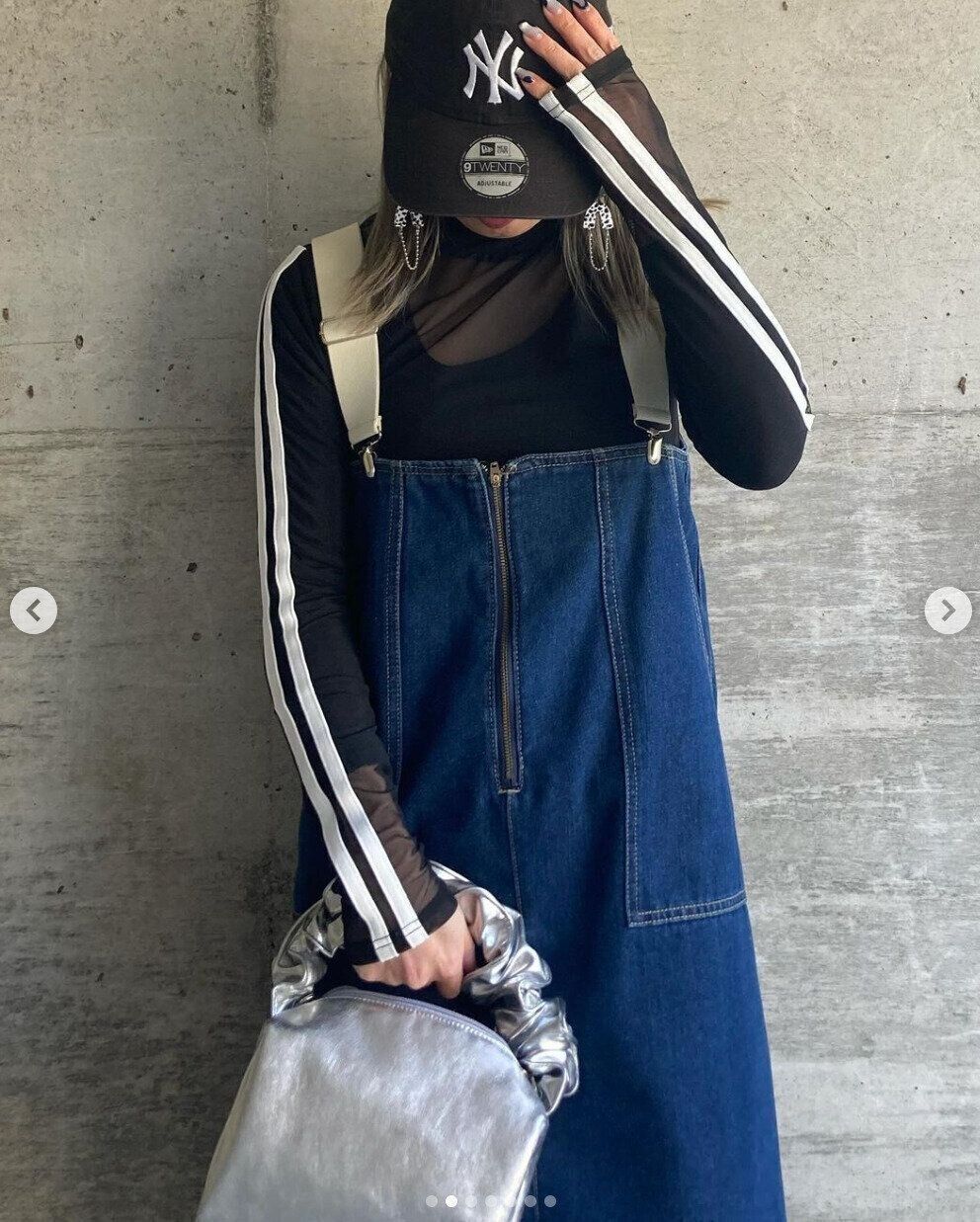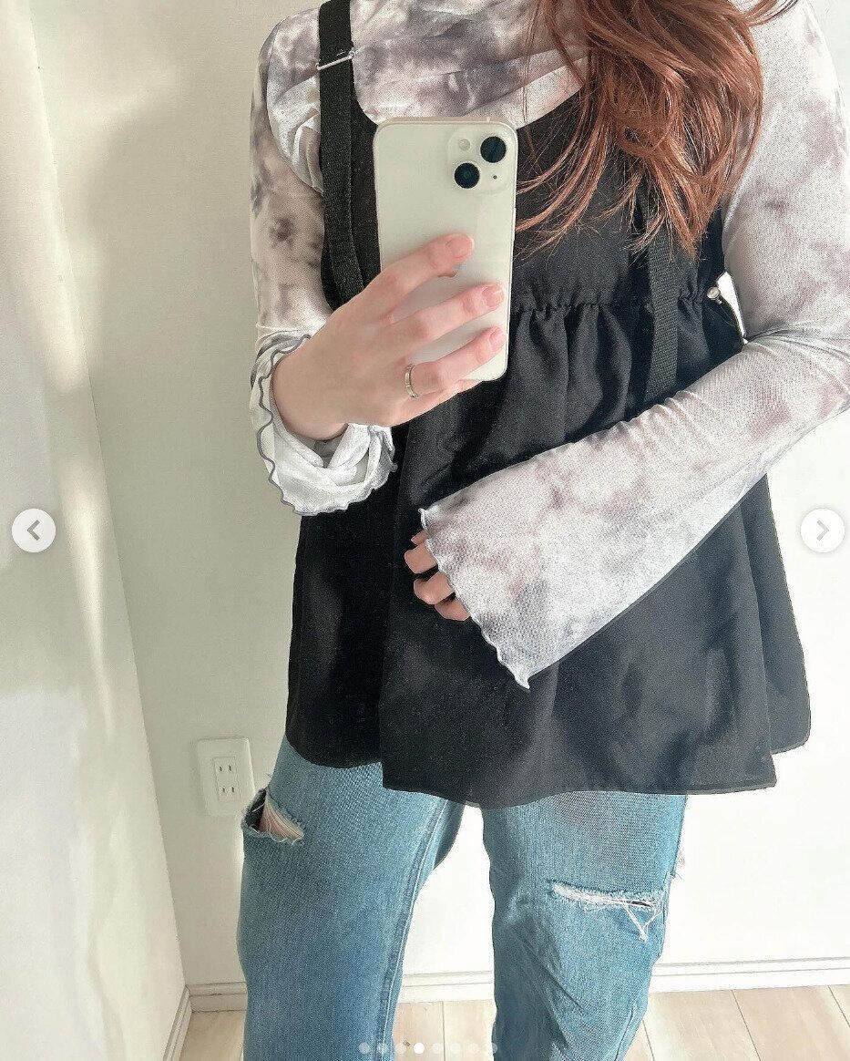 こちらは____a.r13さんがしまむらで購入した、タイダイ柄のシアートップス。同じくしまむらでゲットしたビスチェとの組み合わせが、ドンピシャのかわいさなんだとか♪ シアートップスは、そでがフレアになっており、細見え効果があるとのこと◎