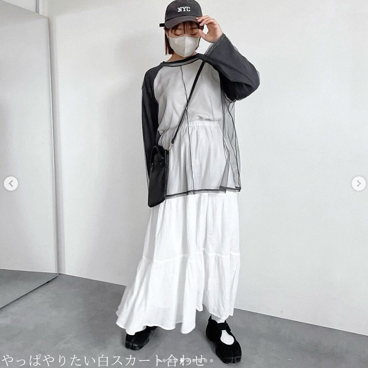 saharu_87さんが「発売前からときめいていた」という、こちらのトップス。ラグランTシャツとシアートップスが、セットになっているんだとか。こちらの投稿のようにホワイトのスカートと合わせると、春らしくてとてもオシャレですよね♪