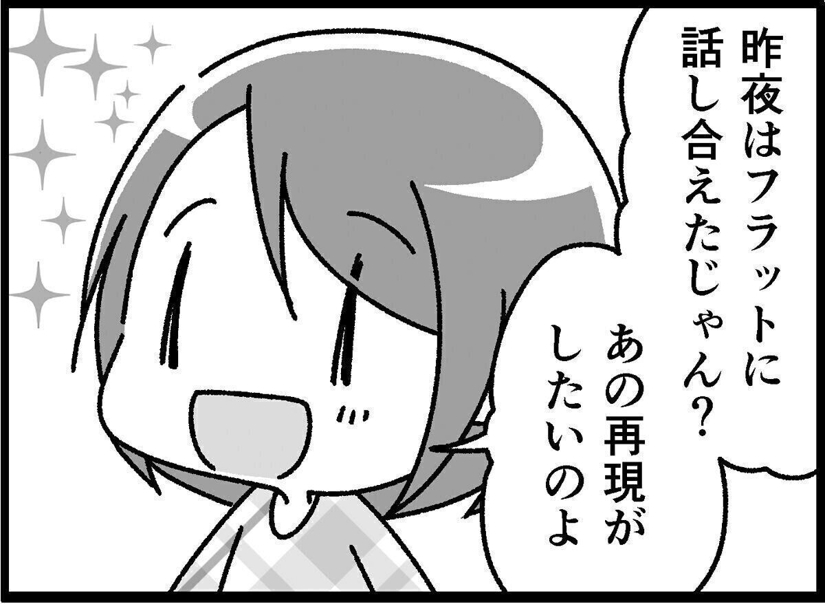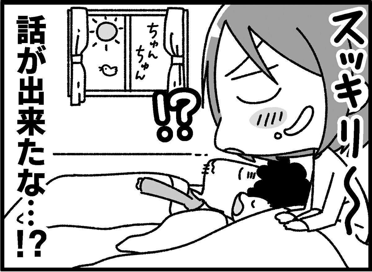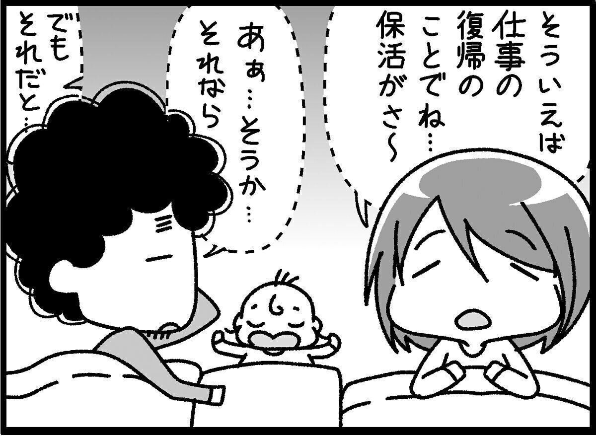 夫と真面目な話し合いをしたいのに、できないまま数日が経過。しかし、ある夜、たまたま夫婦2人揃って子供の寝かしつけをしていた時のこと。暗く静かな部屋で、ぐっすりと眠った娘を横目に、なんとなく夫との会話が始まりました。最初は他愛のない世間話だったのですが、徐々に真面目な話や重たい話も……。