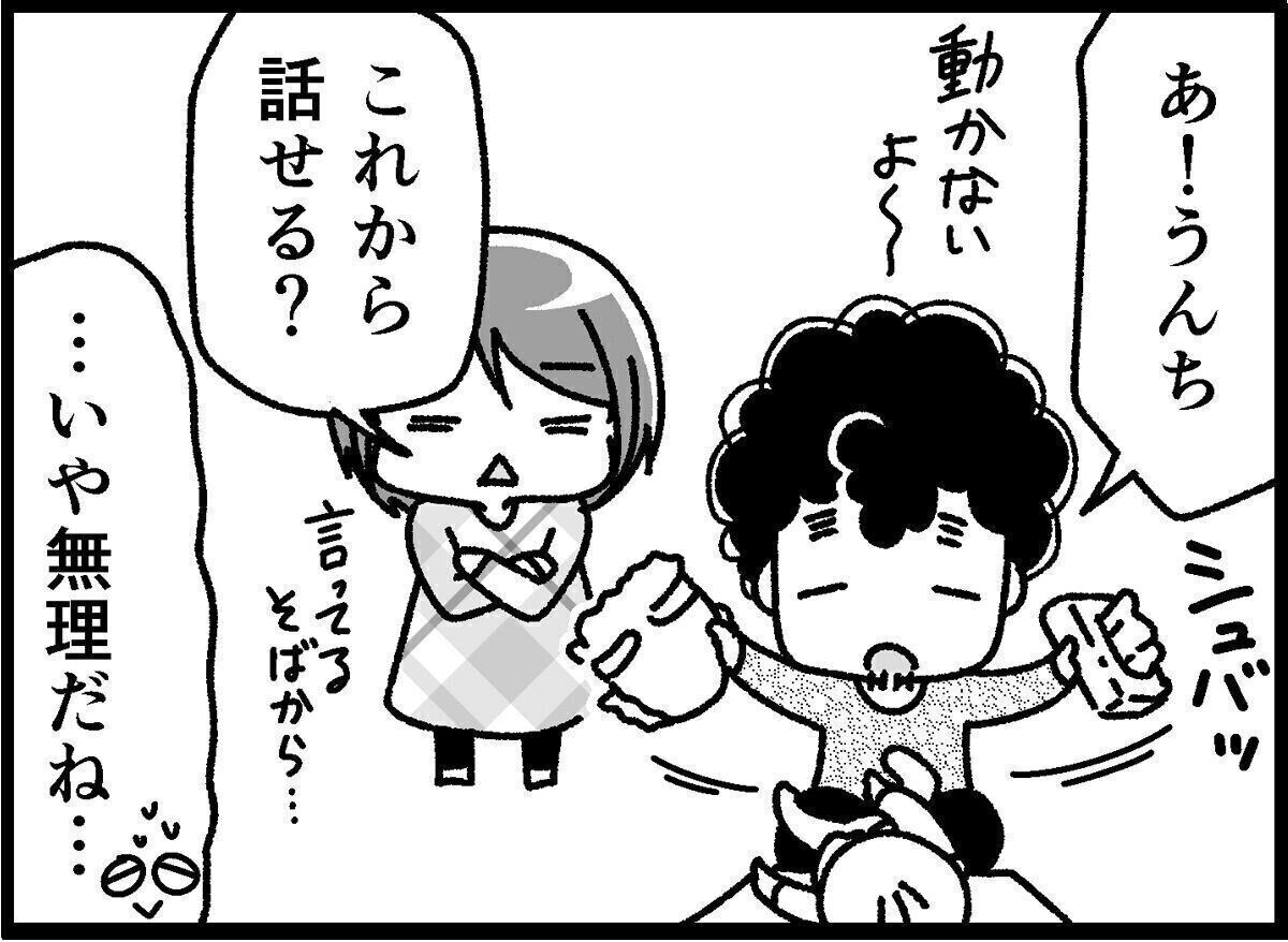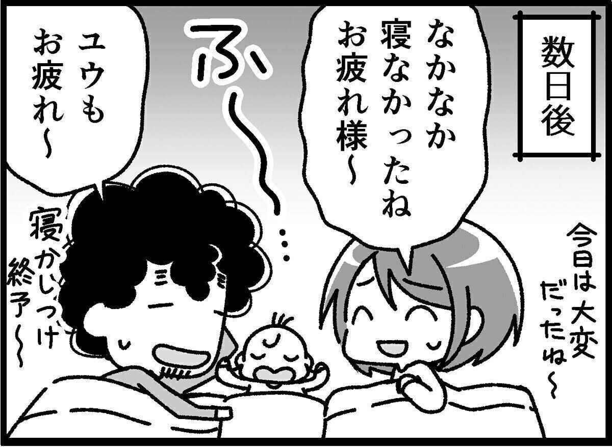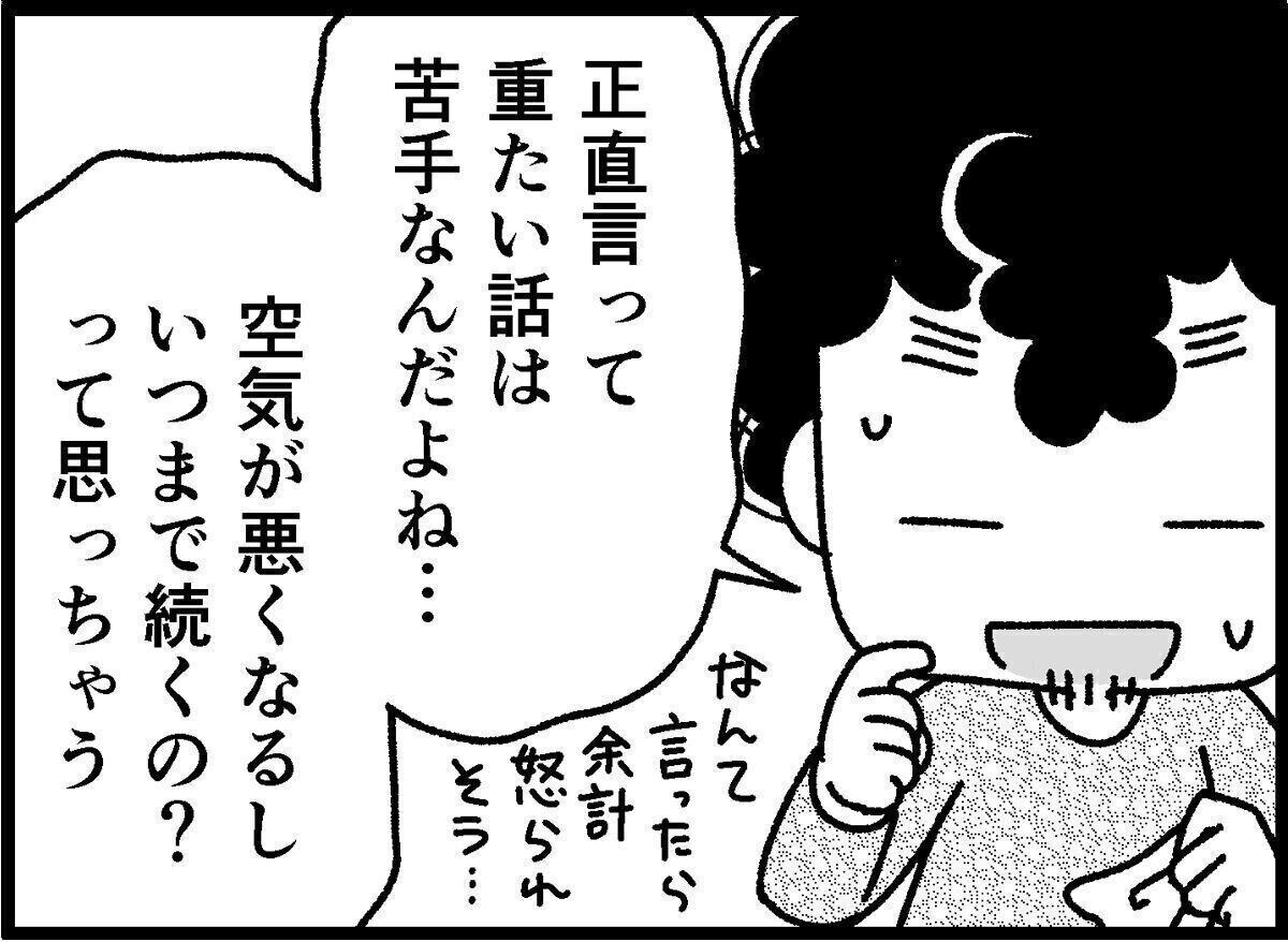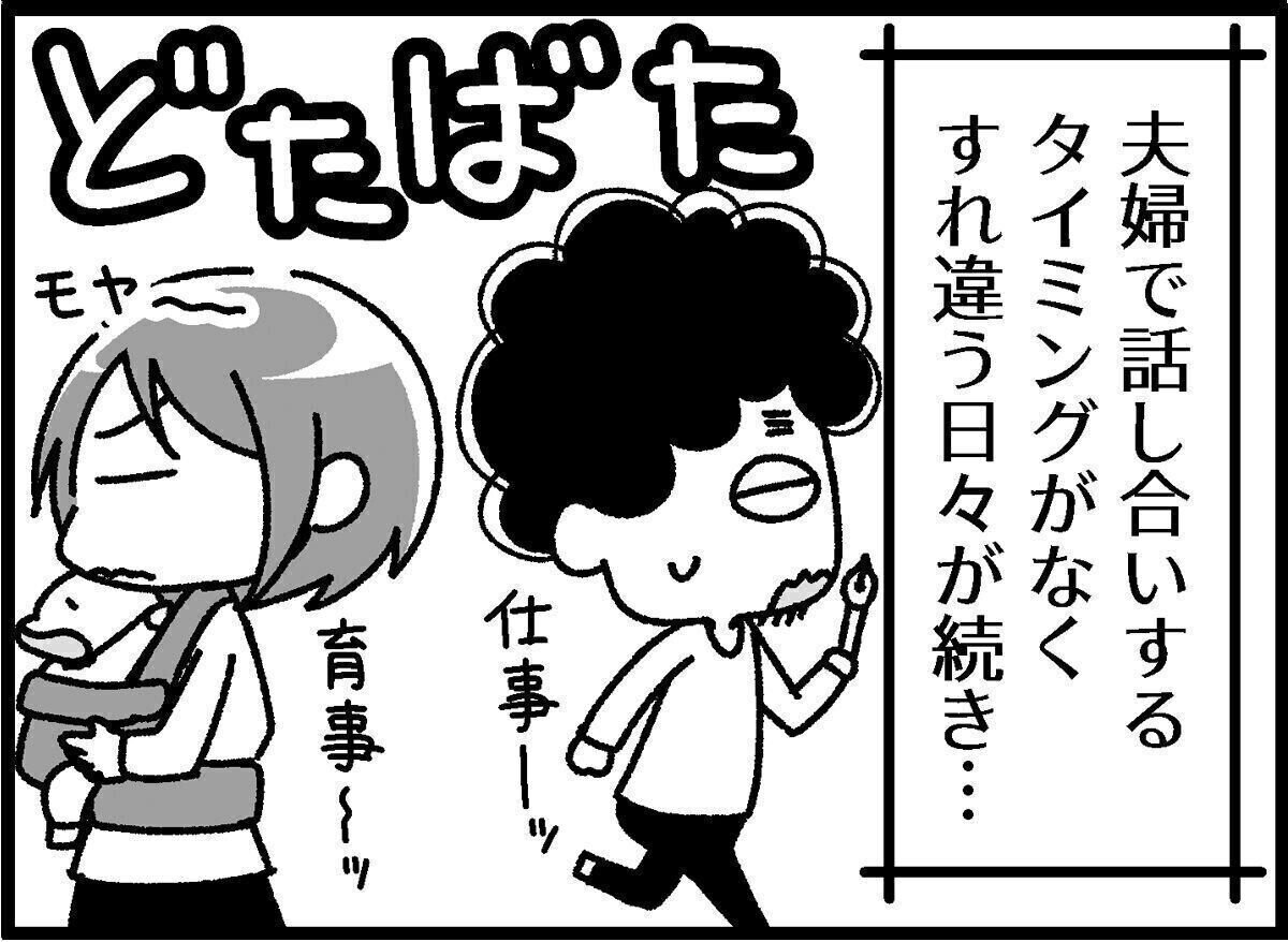 夫と真面目な話し合いをしたいのに、できないまま数日が経過。しかし、ある夜、たまたま夫婦2人揃って子供の寝かしつけをしていた時のこと。暗く静かな部屋で、ぐっすりと眠った娘を横目に、なんとなく夫との会話が始まりました。最初は他愛のない世間話だったのですが、徐々に真面目な話や重たい話も……。