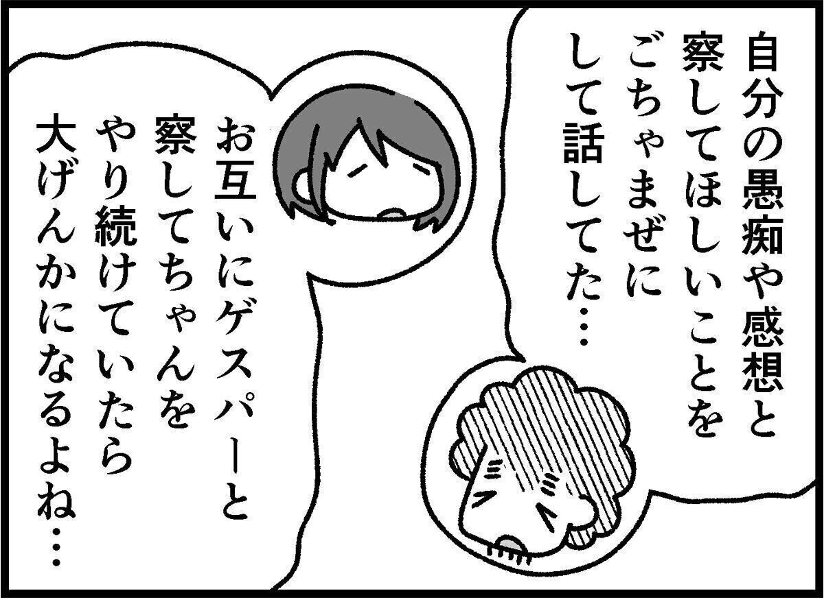 パートナーの何気ない発言を悪いほうにとったり、裏にある意図を勘ぐったり……いわゆるゲスパーになって怒ってしまった青鹿さん。けれども、パートナーが察してちゃんになっていた可能性もなきにしもあらずなので、もう直接聞いてみることに!