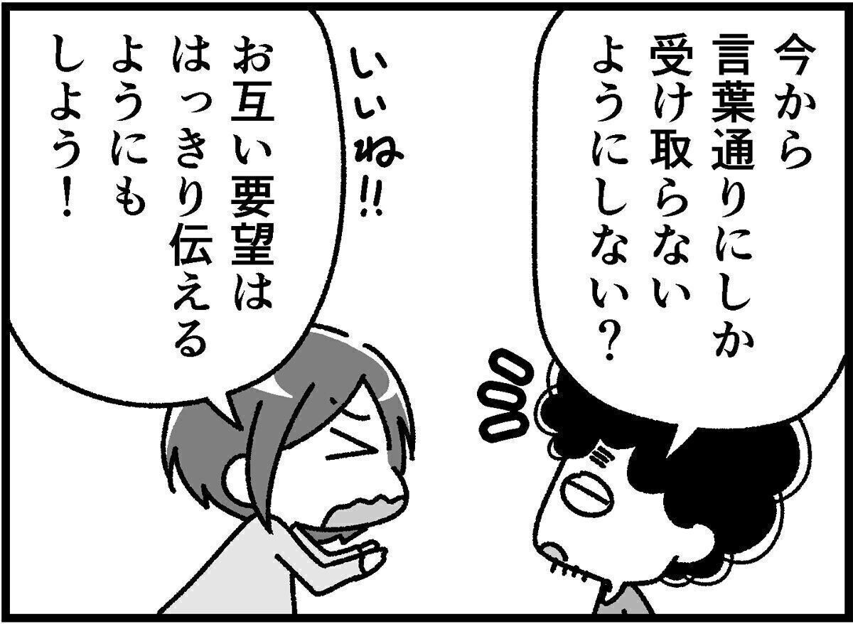 そこで、察し合うのは無理だと思った私たちは、「今から”言葉通りに受け取る”にしよう」と決めました。相手に何かをしてほしいときはきちんと口に出して言う。相手が口に出さないことを勝手に読み取らない。言葉の裏も正しくなんて読めないから読まない。こんなルールでやっていくことにしました。