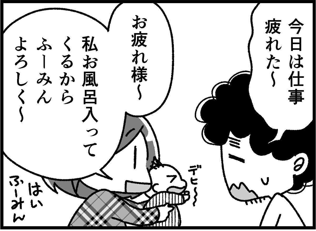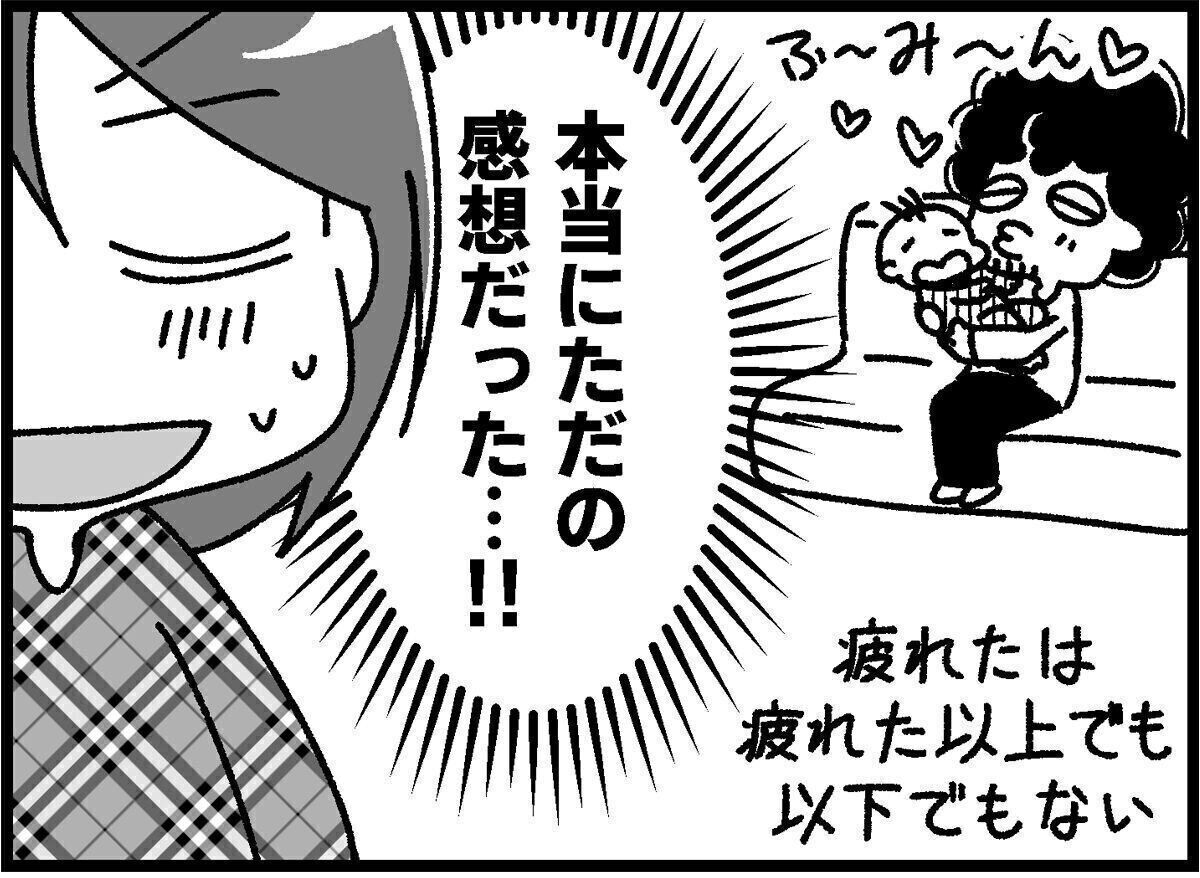 疲れたから子育てしたくないというわけでもなく、「お疲れ様。じゃあ私、先にお風呂入ってくるから」とふーみんの世話をお願いしても嫌な顔ひとつせず(むしろキャッキャウフフタイムが始まった)、本当にただただ「疲れた」という感想だったんだと思いました。