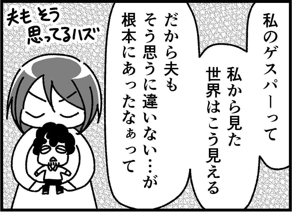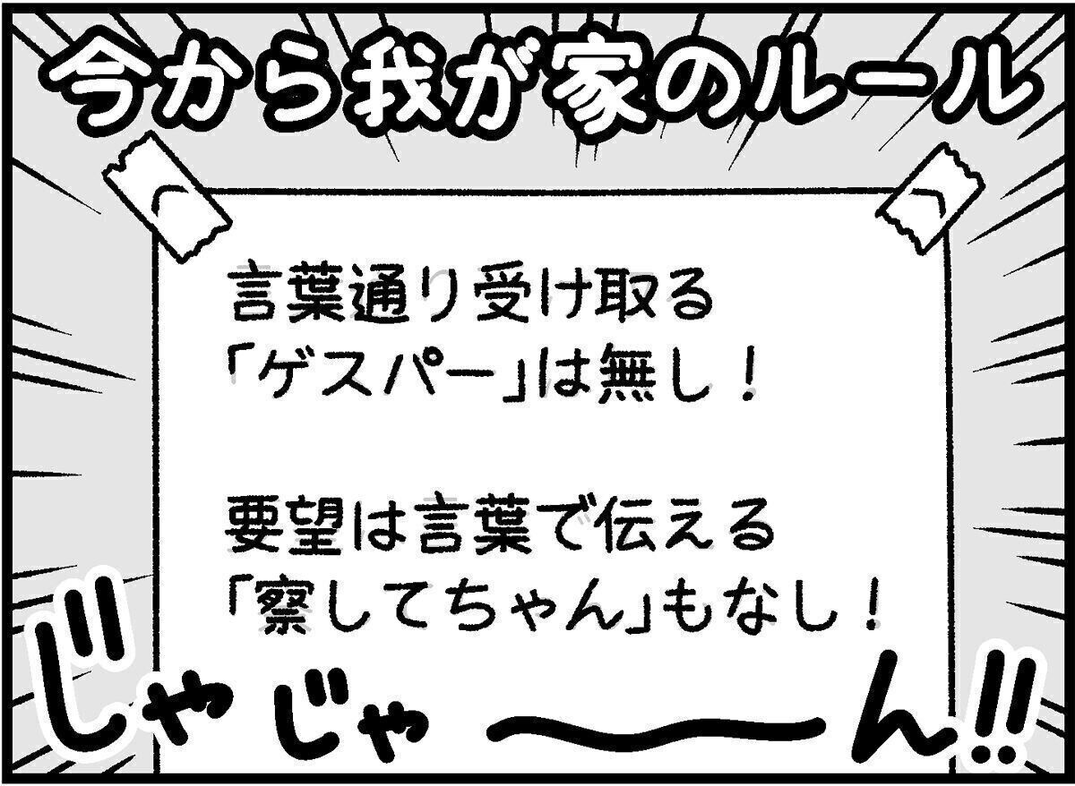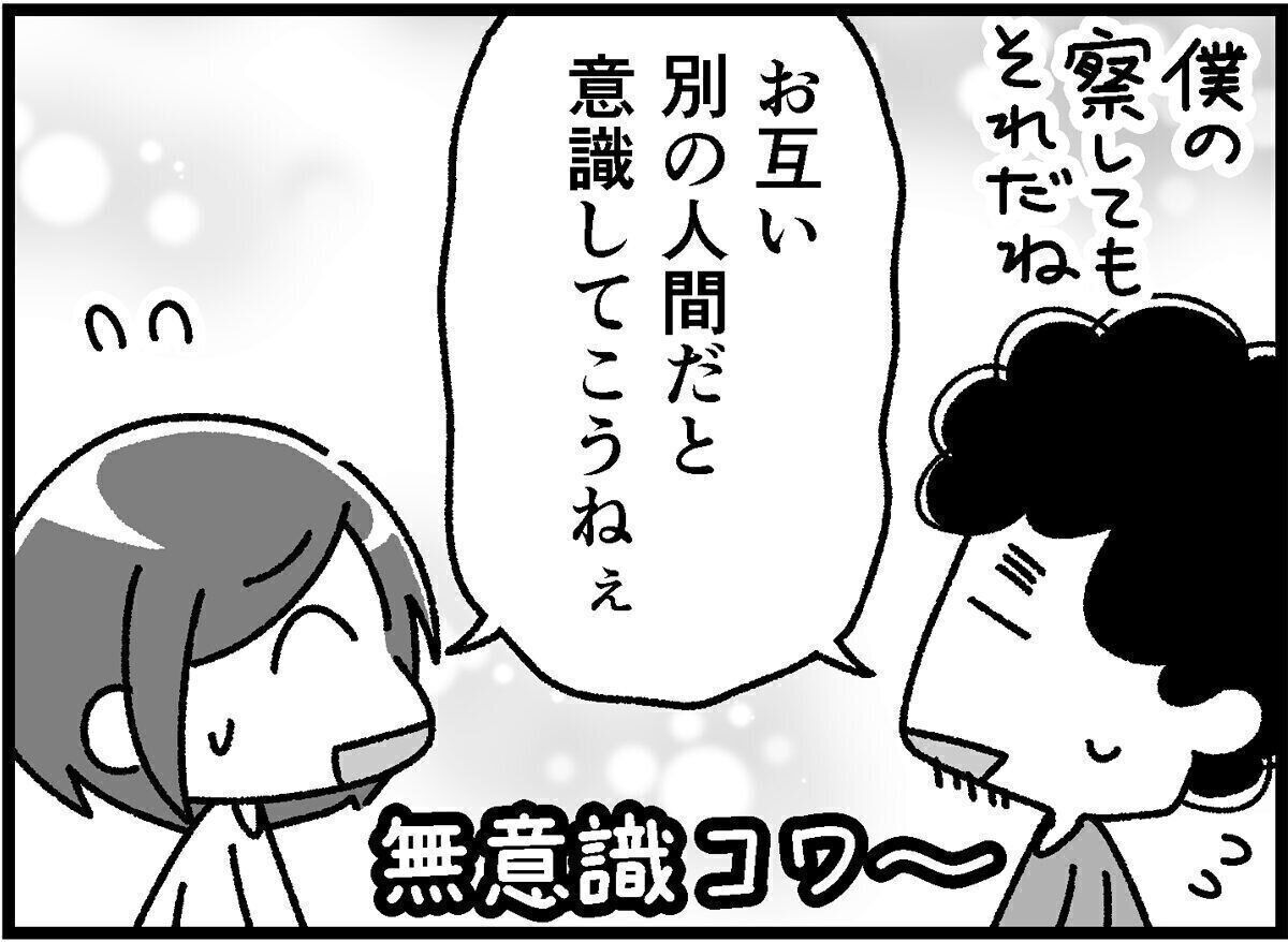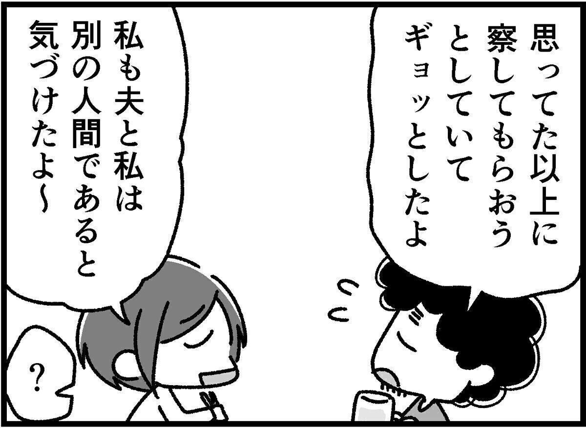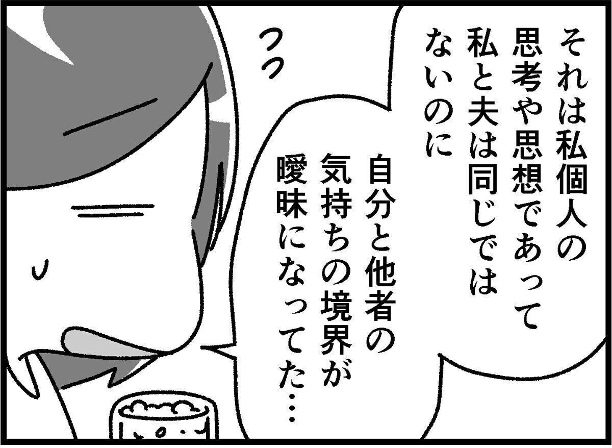 夫の言葉を悪く受け取る「ゲスパー」になっていた青鹿さん、はっきり口に出さず妻に伝えようと「察してちゃん」になった夫。お互いに反省し、相手の言葉は額面通りに受け取るようにしました。そうして、こうなった理由はお互いの間の自他境界が曖昧になっていたからだと気づきます。