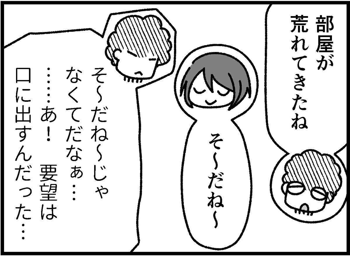 我が家は、頻繁に掃除についてで揉めがちなんですが、「自分の要望は何か?」をしっかり認識し、自分をコントロールするためにも、いさかいになりそうな要望は言葉を選びながら口に出すのはとてもよいことだと思ったそうです。私自身も「察して動かなきゃ」というストレスがなくなり、よい意味で「言われてないから、望まれてない」と焦らないですむようになりました。
