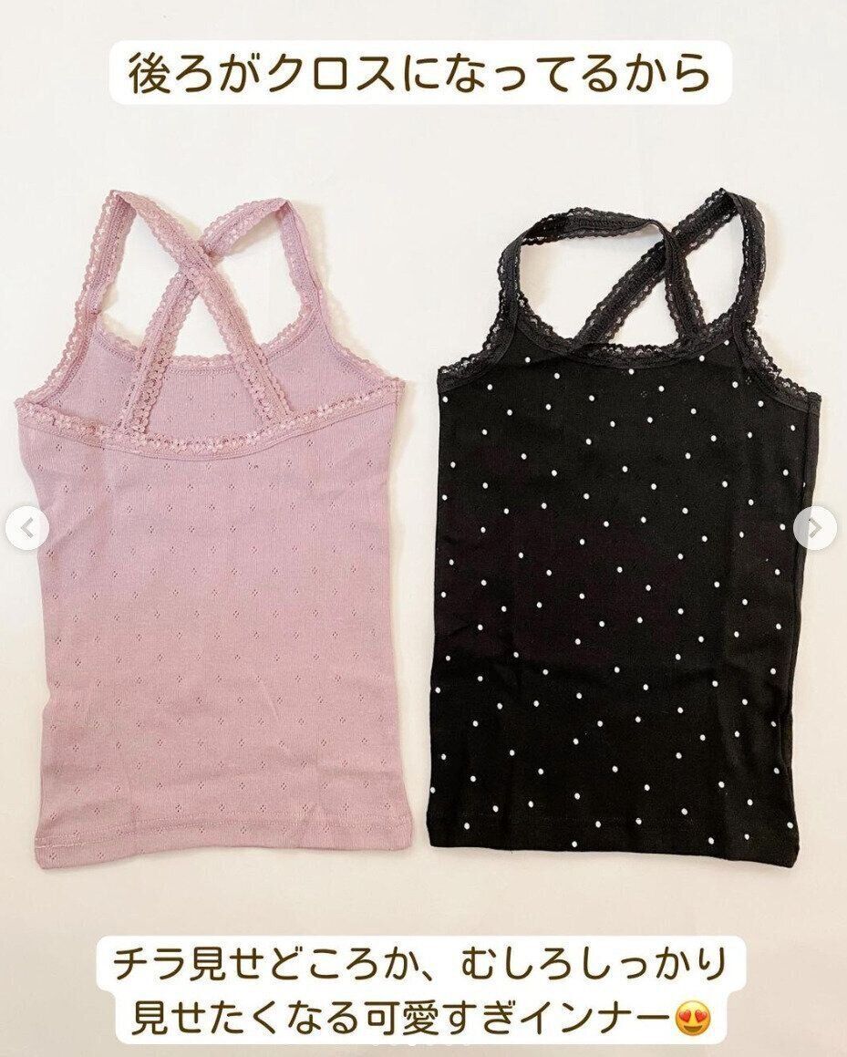 こちらはyuzuko1234さんが購入した、2枚セットのインナーキャミソール。後ろがクロスになっており、背中があいた服から見えても、とてもかわいいんだとか♪ 夏のインナー問題に悩んでいた人に、絶対買ってほしいアイテムなんだそうです◎