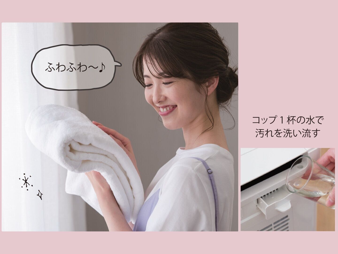ホコリやゴミなどで汚れやすい除湿機の中も、コップ1杯(約200mL)の水で洗い流す清潔機能付き!